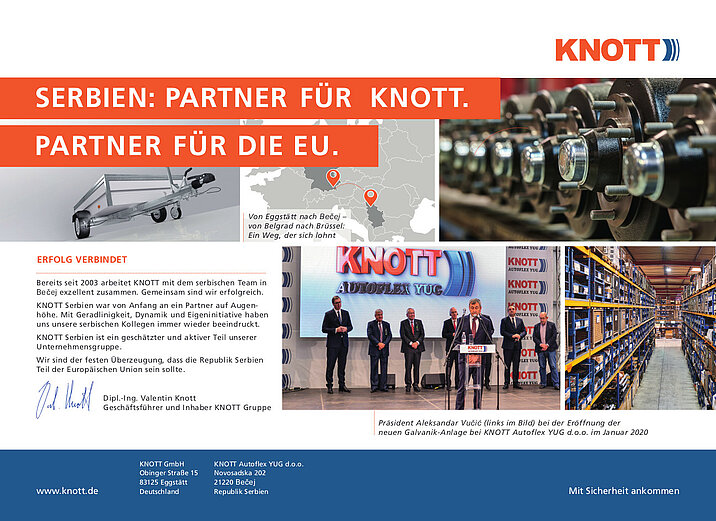 Der Eröffnungsfeier in der neuen Knott-Anlage in Becej haben auch Ministerpräsident der Provinz Vojvodina Igor Mirovic, Präsident der Provinzversammlung Istvan Pastor, Botschafter der Bundesrepublik Deutschland in Serbien Thomas Schieb, Geschäftsführer und Mitinhaber von Knott Autoflex Ungarn H Szabo Sandor, Direktor der Knott Gruppe Deutschland Valentin Knott und der Bürgermeister von Becej Dragan Tosic beigewohnt.